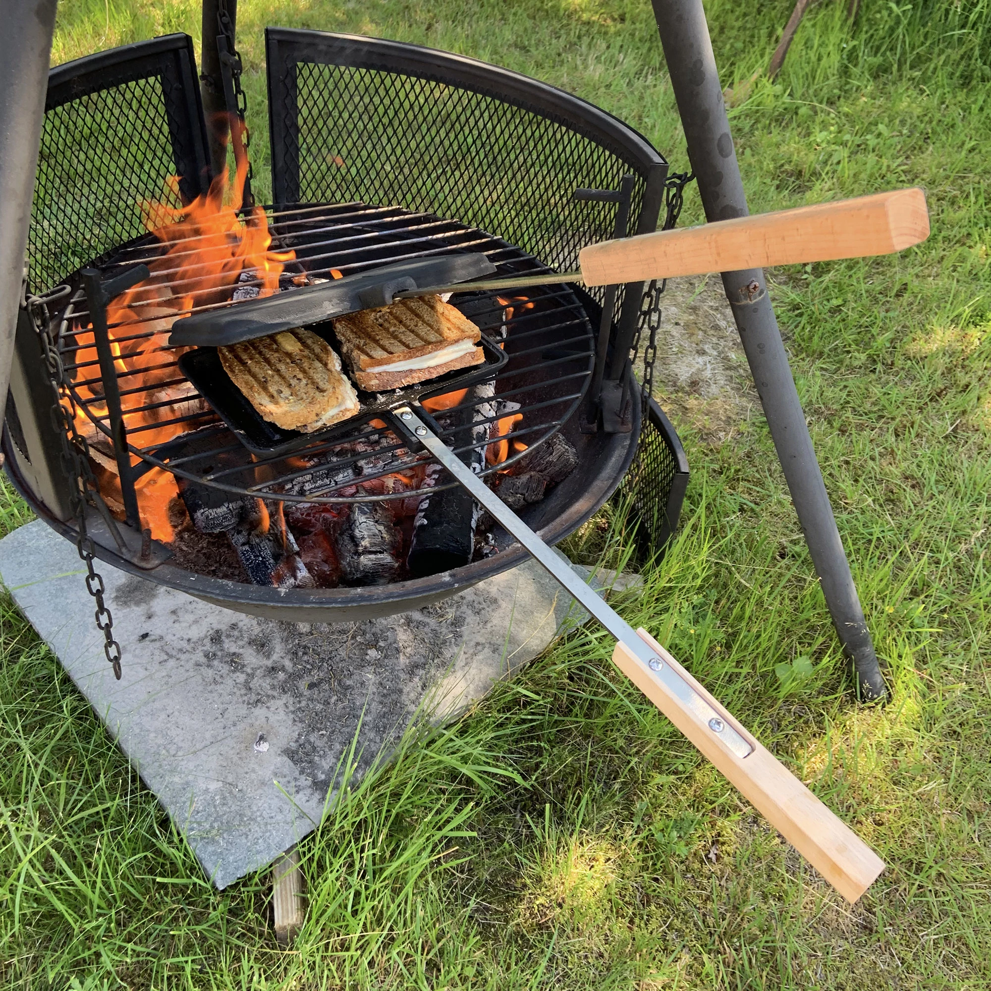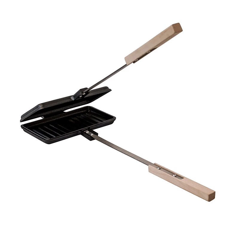 Ostesmørbrødjernet Niste i solid støpejern holder lenge på varmen, og har et ekstra langt håndtak i stål og tre, perfekt for bruk over bålet og bålpannen.