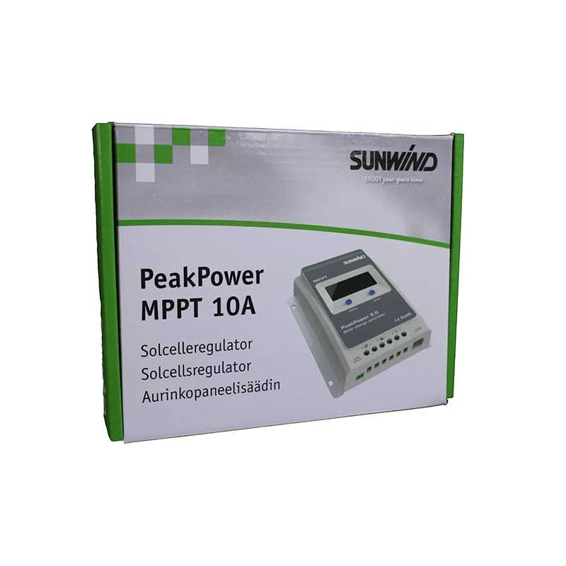 Regulatoren er justerbar for ulike batterityper: AGM, gel, åpne batterier og bly/syre, og har temperaturkompensert ladning. Peak Power kommer med innebygget LCD-display. 10A maks forbruksstrøm.