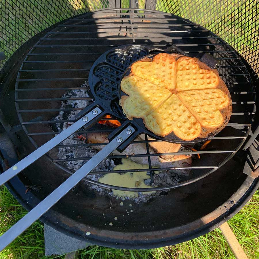 Vaffeljern Bakels i solid støpejern holder lenge på varmen, og har et ekstra langt stål- og trehåndtak perfekt for bruk over bålpannen eller bålet.
